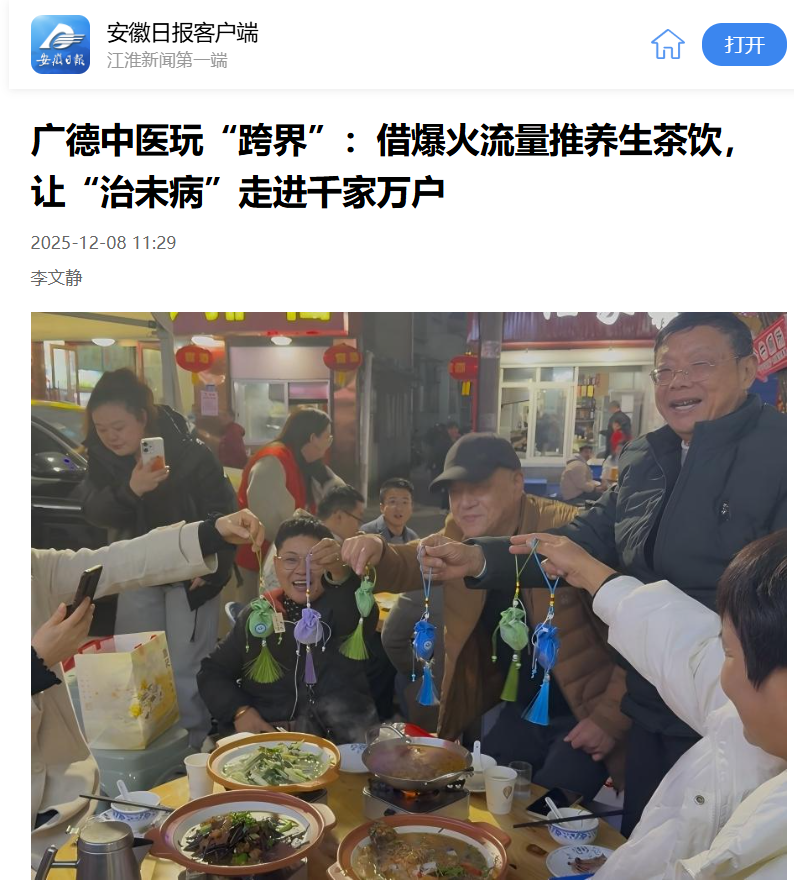 随后安徽日报接力报道,称我院“借爆火流量推养生茶饮,让‘治未病’的理念在烟火气中生根发芽,为中医药文化的创造性转化提供了生动范本。”