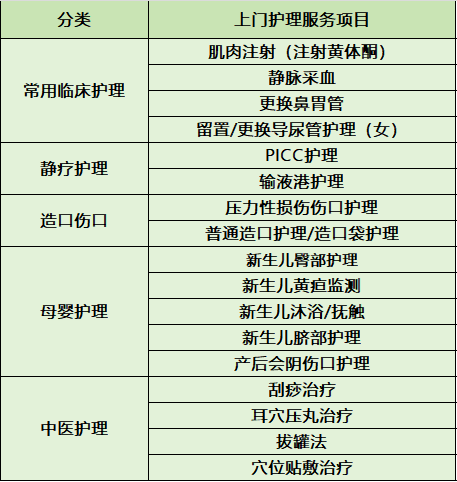 从即日起,我们可以派遣专业的护理人员上门提供肌肉注射、更换鼻胃管、更换导尿管、拔火罐、母婴护理等 17 项上门护理服务。
