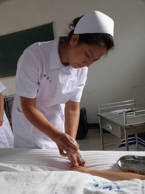 为了迎接2010年宣城市中医药护理技能竞赛,进一步提高护理服务质量,选拔护理人才,为病患者提供优质、高效、满意的医疗服务。自6月底起,护理部组织了全院护理人员进行中医护理技能操作培训,并选拔了4名优秀护理人员备战市中医护理技能大赛。培训内容包括:穴位按摩、拔罐法、灸法、心肺复苏、无菌技术操作等15项内容。图为选手训练现场。