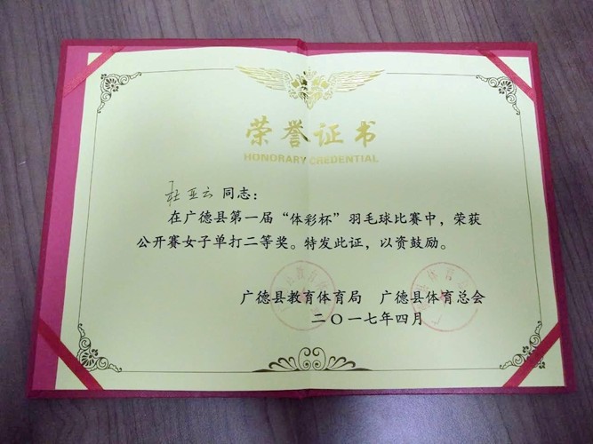 4月25日上午,广德县第一届“体彩杯”羽毛球比赛在体育中心羽毛球馆拉开序幕。来自全县46个机关、企、事业单位的260余名羽毛球爱好者分别参加了男单、女单、男双、混双、团体赛的比赛。运动员们的精彩表现赢得了观众的满堂喝彩,充分展现了各单位职工健康的体魄和精湛的球艺。比赛中,我院派出的选手表现出顽强拼搏的竞技精神,同时也发挥了团队的协作意识,最终获得团体赛公务组“二等奖”的好成绩。陈仁平与周颖共同荣获“混合双打二等奖”。周颖获得“女子单打一等奖”,陈仁平获得“男子单打二等奖”,杜亚云获得“女子单打二等奖”。