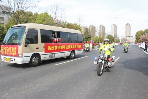 昨日下午2点,支援湖北医护人员所乘大巴车驶出广德东高速路口,车队在警车的护卫下缓缓驶入市区。道路两旁,自发前来迎接的市民有的手持五星红旗热情欢呼,有的默默鞠躬表示敬意。我院医护人员手拉“最美逆行者欢迎您回家”红色条幅夹道欢迎战友归来。车队所到之处,尽是赞美与掌声,表达着市民对援鄂战疫英雄的最高礼遇和最深敬意。