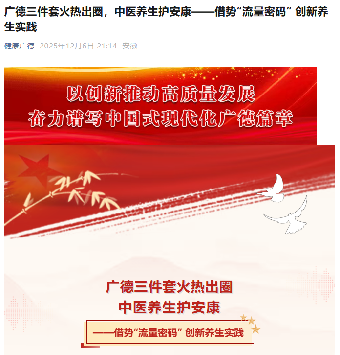 广德市中医院推出的“养生三件套”,将中医药文化融入市井烟火,不仅让游客带走舌尖与身心的暖意,让中医药文化在新时代焕发蓬勃生机,更把城市短期热度转化为长效经济增量,以千年中医智慧守护群众健康,推动广德从“流量出圈”迈向“价值沉淀”,真正实现“爆红”变“长红”、“流量”变“留量”的长效跨越。