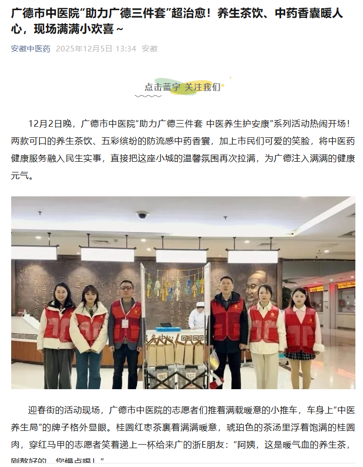 一杯暖茶、一枚香囊,一份问候,在广德市中医院的养生驿站点,医护人员递出的不仅是温热的养生茶和藏着健康的中药香囊,更是中医“治未病”的健康关怀。这份“即时温暖”刚推出,就被“安徽文旅”、“直播宣城”抖音号率先报道,镜头里市民接过茶饮时的笑容,成了冬日最治愈的画面。